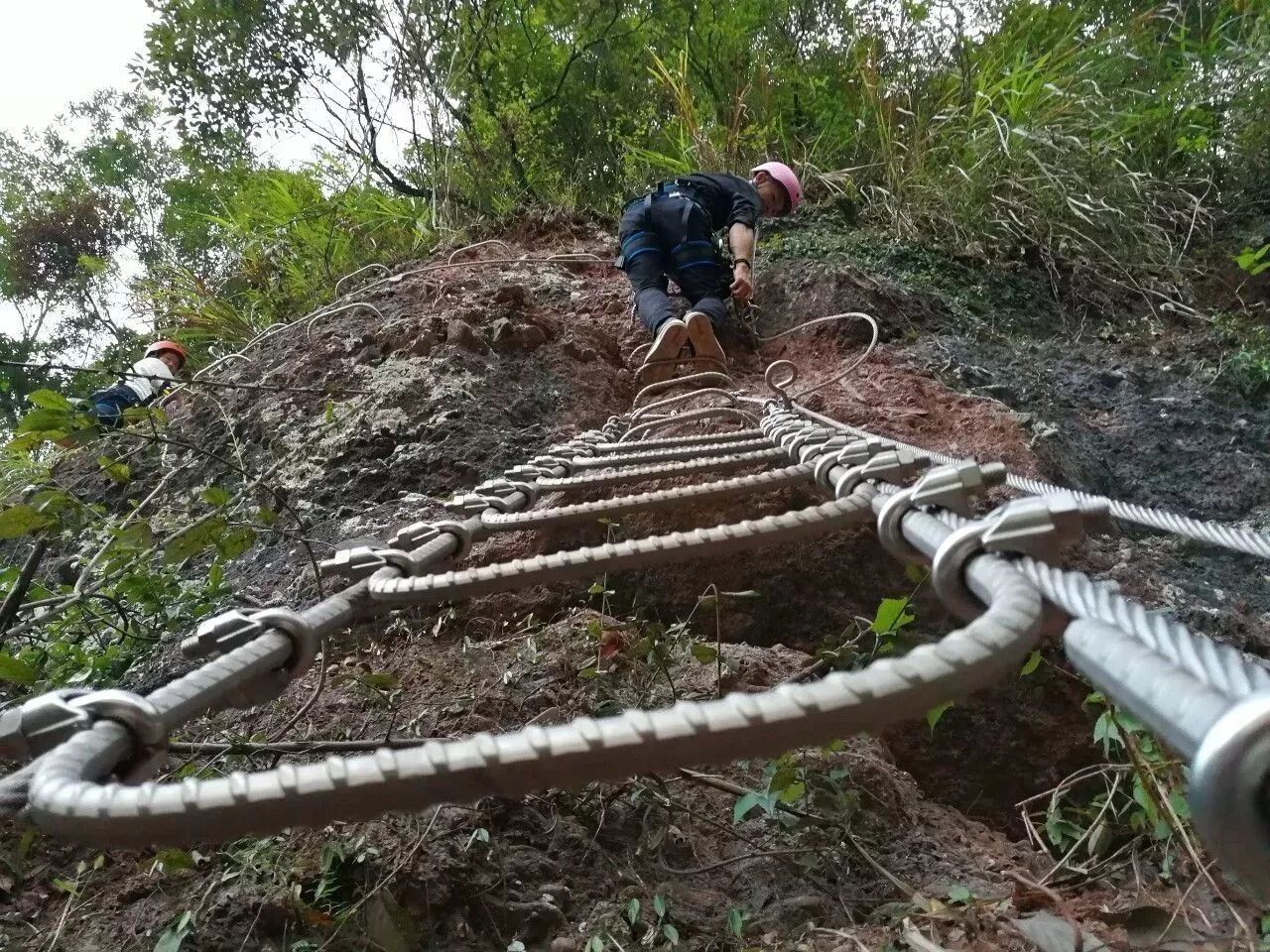 施工人员在垂直的岩壁上,用电钻打出孔桩,再往孔桩中插入钢制把手,再用专用胶水固定。缆索、脚蹬、手抓环等来自法国和捷克。被安装在岩石上,可以承受2.8顿以上的拉力。